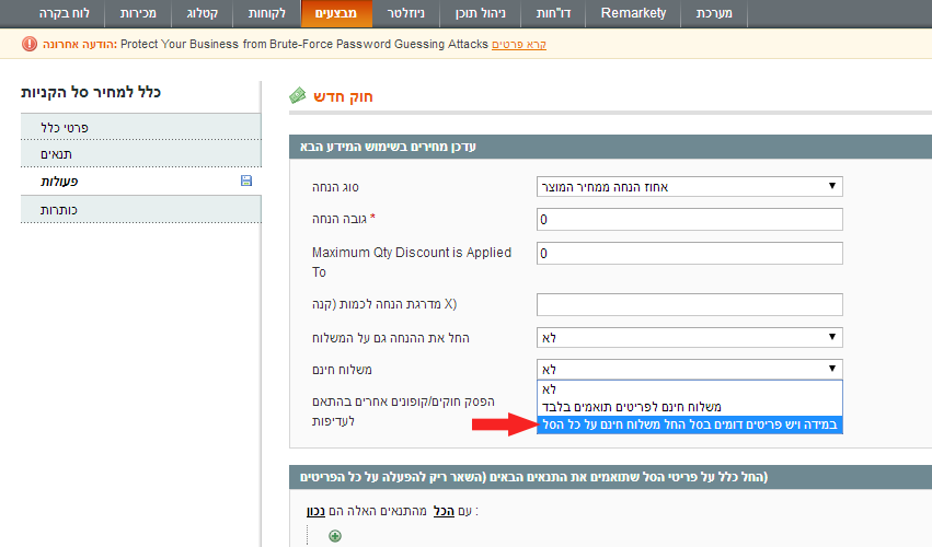 הפעם, בניגוד למבצעים אחרים שיצרנו, לא נתן נבחר ערך ב "סוג הנחה" או בגובה ההנחה (השאירו את הבחירה בסוג הנחה כפי שהיא, גובה הנחה על 0), אלא נתעסק רק ב "משלוח חינם".